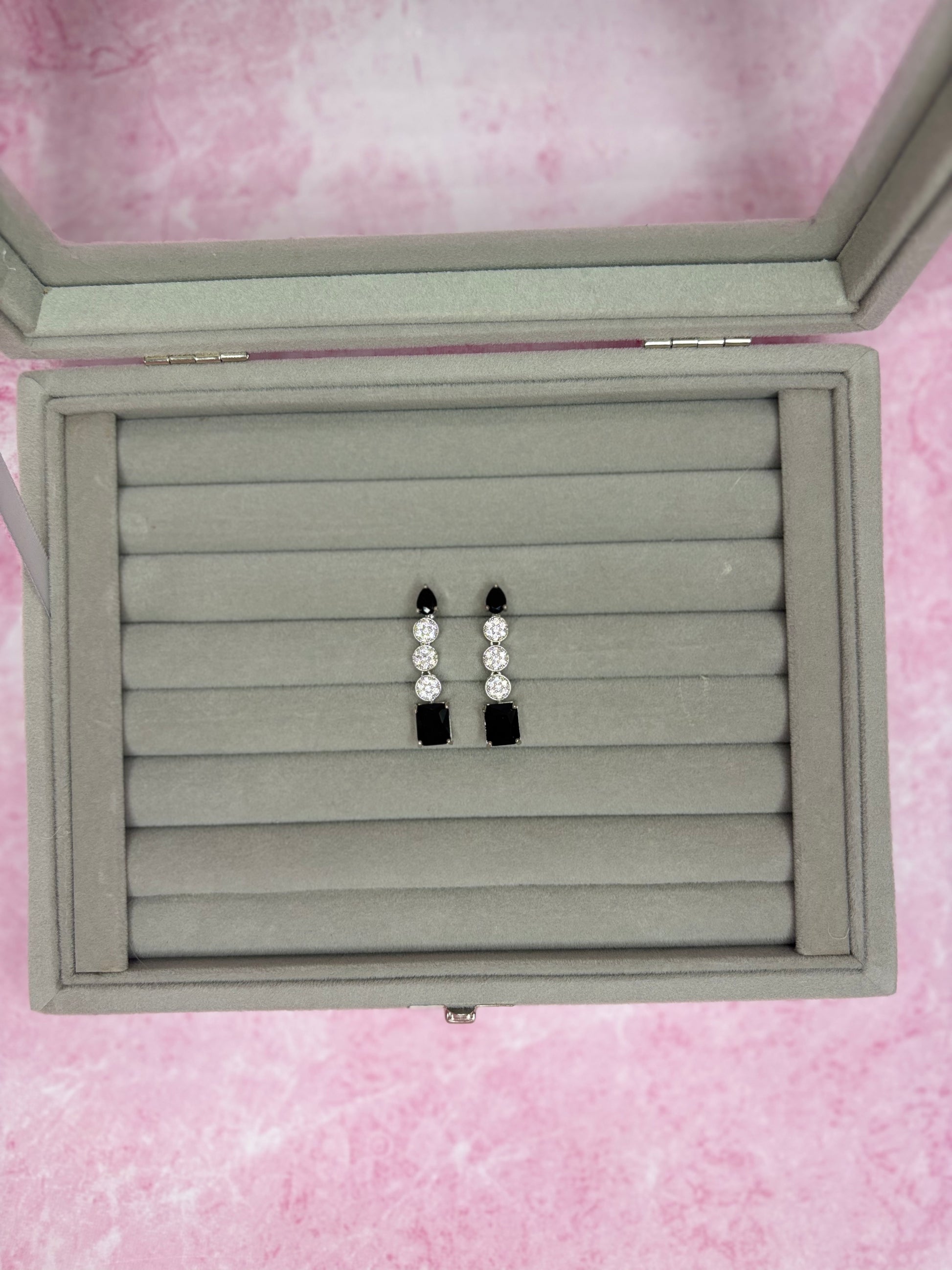 Jewelry Set : These black squared earrings offer a modern edge to any ensemble. Their sleek geometric design brings sophistication and versatility, perfect for both everyday wear and special occasions. Crafted to highlight clean lines and bold contrast, they add a striking yet understated touch that complements various styles with confidence.